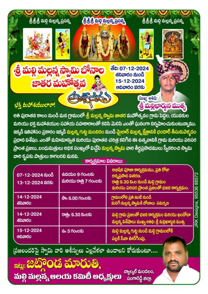 తేదీ 7 /12/2024 నుండి 15/12/2024 వరకు జరిగే మల్గి మల్లన్న బోనాల జాతర కరపత్రాలు విడుదల చేసిన ఆలయ కమిటీ అధ్యక్షుడు జట్గొండ మారుతి వారితో పాటు ఈ కార్యక్రమంలో మాజీ ఎంపీటీసీ శివానంద శ్రీపతి మాజీ ఆత్మ కమిటీ డైరెక్టర్ బడక రాజు మాజీ వార్డు సభ్యులు సిద్దారెడ్డి విట్టల్ గ్రామ పెద్దలు