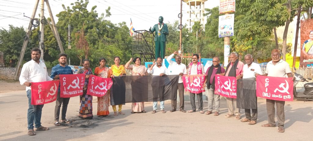 మీ న్యూస్ ప్రతినిధి డిసెంబర్ 20::::: పార్లమెంట్ సాక్షిగా రాజ్యాంగ నిర్మాత, డాక్టర్ బాబాసాహెబ్ అంబేద్కర్ ను అవమానపరిచిన కేంద్ర హోంశాఖ మంత్రి అమిత్ షా ను వెంటనే బర్తరఫ్ చేయాలని సీపీఐ(ఎం.ఎల్) మాస్ లైన్ సూర్యాపేట జిల్లా కార్యదర్శి కొత్తపల్లి శివకుమార్ ప్రభుత్వాన్ని డిమాండ్ చేశారు.ఈరోజు సూర్యాపేట జిల్లా కేంద్రంలోని తెలంగాణ చౌరస్తా అంబేద్కర్ విగ్రహం దగ్గర సీపీఐ(ఎం.ఎల్) మాస్ లైన్ ఆధ్వర్యంలో నల్ల జెండాలతో నిరసన తెలియజేయడం జరిగింది. ఈ సందర్బంగా సీపీఐ(ఎం.ఎల్) మాస్ లైన్ జిల్లా కార్యదర్శి కొత్తపల్లి శివ కుమార్ మాట్లాడుతూ కేంద్ర హోం శాఖ మంత్రి అమిత్ షా పార్లమెంటులో మాట్లాడుతూ ప్రతి ఒక్కరూ అంబేద్కర్ అనే మాటను ఉచ్చరించటం ఫ్యాషన్ అయిపోయింది అని, దీనికి బదులు రామనామ స్మరణ చేస్తే ఏడు జన్మల ముక్తి లభిస్తుందని పేర్కొనటం, అంబేద్కర్ ను అవమానపరచటమే కాక, హిందూ మతోన్మాదాన్ని రెచ్చగొట్టడమే అవుతుందని అన్నారు. కేంద్ర మంత్రులు మొత్తం హిందూ మతాన్ని రెచ్చగొడుతూ దేశాన్ని లౌకిక రాజ్యాంగం నుండి హిందూ రాజ్యాంగంగా మార్చాలని ప్రయత్నిస్తున్నారని అన్నారు. అంతేకాకుండా పార్లమెంటులో దొడ్డిదారిలో ప్రవేశపెడుతున్న బిల్లులు ఆమోదం పొందడం కోసం ఇలాంటి వ్యాఖ్యానాలు చేసి, అసలు విషయాన్ని పక్కకు నెడుతున్నారని ఆరోపించారు. ఒకే దేశం ఒకే ఎన్నిక అనే విధానం పార్లమెంటులో ప్రవేశపెట్టే సందర్భంలో దేశంలో ప్రతి ఒక్కరు ఇది రాజ్యాంగ విరుద్ధమని నిరసన తెలియజేస్తున్న క్రమంలో దానిని పక్కదారి పట్టించడం కోసం అంబేద్కర్ ను అవమాన పరిచే విధంగా అమిత్ షా వ్యాఖ్యానించడం సిగ్గుచేటు అన్నారు. ఏ వ్యక్తి చేత రాజ్యాంగం రాయబడిందో ఆ రాజ్యాంగం మీద ప్రమాణం చేసిన మంత్రి ఆ రాజ్యాంగ కర్తను అవమానపరచడం, కచ్చితంగా రాజ్యాంగాన్ని ఉల్లంఘించడమే అవుతుంది అని అన్నారు. రాజ్యాంగాన్ని ఉల్లంఘించిన అమిత్ షా పై దేశద్రోహు కేసు పెట్టాలని డిమాండ్ చేశారు.అమిత్ షా రాజీనామా చేసేంత వరకు దేశవ్యాప్తంగా వివిధ సంఘాల ఆధ్వర్యంలో బలమైన ప్రజా ఉద్యమాలు నిర్వహిస్తామని ప్రభుత్వాన్ని హెచ్చరించారు. ఈ కార్యక్రమంలో సీపీఐ(ఎం.ఎల్) మాస్ లైన్ జిల్లా కమిటీ సభ్యులు కారింగుల వెంకన్న,పిఓడబ్ల్యు జిల్లా ప్రధాన కార్యదర్శి కొత్తపల్లి రేణుక, పిడిఎస్యు రాష్ట్ర సహాయ కార్యదర్శి ఎర్ర అఖిల్ కుమార్, అఖిలభారత ప్రగతిశీల వ్యవసాయ కార్మిక సంఘం రాష్ట్ర నాయకులు పేర్ల నాగయ్య,అరుణోదయ సాంస్కృతిక సమాఖ్య జిల్లా కన్వీనర్ గొడ్డలి నరసయ్య,పార్టీ డివిజన్ కమిటీ సభ్యులు ఎస్కే సయ్యద్, చిత్తలూరి లింగయ్య, పిఓడబ్ల్యు జిల్లా ఉపాధ్యక్షులు సూరం రేణుక, కోశాధికారి మోటకట్ల జయమ్మ,ఐతరాజు పద్మ,శంకర్,రాహుల్ తదితరులు పాల్గొన్నారు.