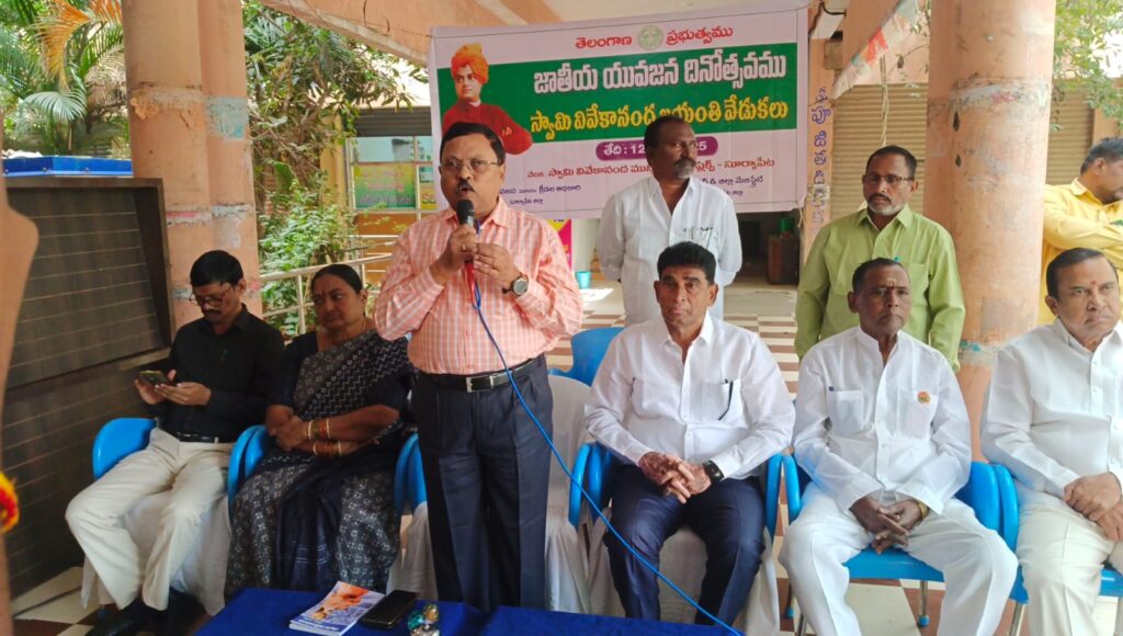 మీ న్యూస్ సూర్యాపేట జిల్లా ప్రతినిధి జనవరి 12::::స్వామి వివేకానంద స్ఫూర్తితో యువత ముందుకు సాగాలని జాయింట్ కలెక్టర్ పి రాంబాబు అన్నారు. ఆదివారం సూర్యాపేట జిల్లా కేంద్రం మున్సిపాలిటీ కార్యాలయం ఉత్సవ కమిటీ ఆధ్వర్యంలో ఏర్పాటు చేసిన కార్యక్రమంలో వారు ముఖ్య అతిథిగా పాల్గొని వివేకానందుని చిత్రపటానికి పూలమాలలు వేసి నివాళులర్పించారు. అనంతరం వారు మాట్లాడుతూ యువత వివేకనంద అడుగుజాడల్లో నడవాలని ఆయన మాటలే యువతకు స్ఫూర్తిదాయకమని అన్నారు. యువత వివేకానందుని సందేశాలు విన్నంత మాత్రాన సరిపోదని వాటిని యువత ఆచరించాలని తెలిపారు. విద్యార్థులు ధైర్యంగా ఉండి సంఘ సేవ చేయాలన్నారు. భారతదేశ భవిష్యత్తు యువత చేతుల్లోనే ఉందని వారిని ఉత్తేజితుల్ని చేయడం ద్వారానే జాతి భద్రంగా ఉంటుందని వివేకానందుడు ప్రవచించారని వారు గుర్తు చేశారు. సెలవు రోజుల్లో ఒక గంట పాటు విద్యార్థులను సమీకరించి వారిచే వివేకానందుడి గురించి మాట్లాడించాల ని తద్వారా వ్యక్తిత్వ వికాసం తో పాటు సామాజిక పరిజ్ఞానం పెంపొందుతుందన్నారు. అనంతరం వివేకానందుడి వ్యాసరచన పోటీలో గెలుపొందిన విద్యార్థిని విద్యార్థులకు బహుమతులు ప్రధానం చేశారు.మిమిక్రీ ఆర్టిస్ట్ నరేందర్ దేవరకొండ వివేకానంద మీద రచించి పాడిన పాట ప్రేక్షకులను ఆకట్టుకుంది. ఈ కార్యక్రమంలో మాజీ ఎమ్మెల్యే దోసపాటి గోపాల్, మున్సిపల్ చైర్మన్ పెరుమళ్ళ అన్నపూర్ణ, మున్సిపల్ కమిషనర్ శ్రీనివాస్, యువజన క్రీడ యోజన అధికారి రామ్ చందర్, మాజీ మున్సిపల్ చైర్మన్ జుట్టుకొండ సత్యనారాయణ, ఉత్సవ కమిటీ అధ్యక్షులు అంగిరేకుల నాగార్జున, ప్రధాన కార్యదర్శి ప్రభాకర్, కోశాధికారి పర్వతం శ్రీధర్, ఉపాధ్యక్షులు డాక్టర్ కర్ణాకర్ రెడ్డి, తళ్ళమల హసేన్, చలమల నరసింహ, గజ్జల వెంకటరెడ్డి, శానిటరీ ఇన్స్పెక్టర్ సారగండ్ల శ్రీనివాస్, గౌస్ మున్సిపాలిటీ సిబ్బంది తదితరులు పాల్గొన్నారు.
