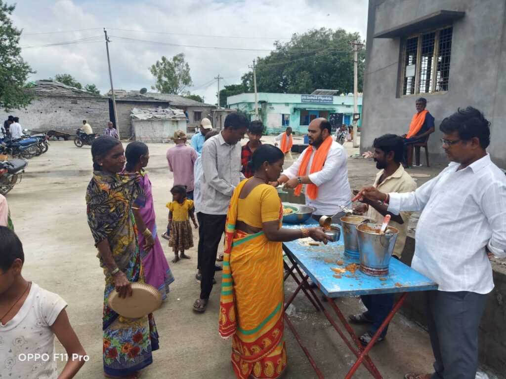 తాండూరు.మీ: న్యూస్ ప్రతినిధి. భక్తి శ్రద్ధతో భగవంతుని కొలవాలని తాండూరు మండల టిఆర్ఎస్ పార్టీ బీసీ సెల్ అధ్యక్షులు ఆర్ సి గౌడ్ పేర్కొన్నారు.మంగళవారం శ్రావణ మాసం సమాప్తి సందర్భంగా మల్కాపూర్ గ్రామంలో వీరాంజనేయ ఆలయంలో ప్రత్యేక పూజలు నిర్వహించి అనంతరం అన్నదాన కార్యక్రమంలో పాల్గొన్నారు.ఈ సందర్భంగా తాండూర్ మండల బీ.ఆర్.ఎస్ పార్టీ బీ సీ సెల్ అధ్యక్షుడు ఆర్.సి గౌడ్ మాట్లాడుతూ అన్ని దానాల కన్నా అన్నదానం గొప్పదని వెల్లడించారు. అన్నం పరబ్రహ్మ స్వరూపమని అన్నారు.ఈ కార్యక్రమంలో గ్రామ పెద్దలు మరియు యువకులు తదితరులు పాల్గొన్నారు.